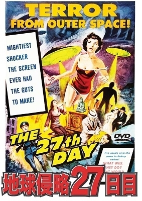 古典なSF映画DVD「地球侵略27日目」原題「THE 27TH DAY」きっちりご当時情勢な地球。今回の宇宙人はイギリス人女性(一般人)、アメリカ人記者、ソビエト人兵士、中国人の農民(女性)、ドイツ人科学者の5人を選んで、とある武器を渡す。しかも、中国で生まれ育った中国人、ソビエト兵も同様で上官も軍人も全部英語。異星人が完成させた兵器なのに、緯度や経度の座標を与えれば、その部分が攻撃されるのも理解不能。納得したのは、異星人がTV放送を乗っ取ったときに、最初は誰も信じないところぐらいですかね。ソビエトが少し悪者的に扱われていたのは冷戦時代だからなのかな。