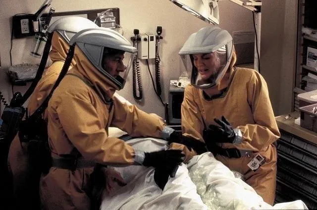 部下のケイシー・シュラー少佐(ケヴィン・スペイシー)、ソルト少佐(キューバ・グッディング・Jr)とともに現地で調査。空気感染はしないが発病後三日で死亡し、死亡率は100パーセント。村は全滅した。最初に道路建設の若者が感染したが、それ以上は不明。