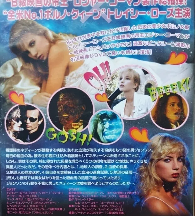 ロジャー・コーマンが自身の監督作“NOT OF THIS EARTH” (57)をリメイクしたSFスリラーで、吸血エイリアンの陰謀がチープに語られる。主演は邦題の示す通り、未成年ということがバレ、業界を追われたポルノ女優トレイシー・ローズ。これが“脱ポルノ”の1作目。ローバジェット極まれりといった造りで、劇中に登場するほとんどの特撮シーンはロジャー・コーマンの諸作からの流用。さて、ロジャー・コーマンのZ級映画の紹介のコーナーがあり、そこで紹介されていたのが本作監督のジム・ウィノースキー、彼の紹介文を書いたのは塩田時敏さんと言う方で、この人の紹介文がもう最高だった!一部引用させてもらうと「ロジャー・コーマンの門下生で最も新しい優等生がウィノースキーである。とにかくこの人は予算をもらえない。もらえないからといっていじけたり、手を抜いたりしない。逆に金の無さを、チープでキッチュな独自のノリ、ウィノースキー・スタイルにまで高めているのが凄いのだ。スコーンと抜けきっているのが彼のスタイルである。」50年代調ピコピコ・サウンドもあわせて、オリジナルより圧倒的に面白くなっている本作。必見です!