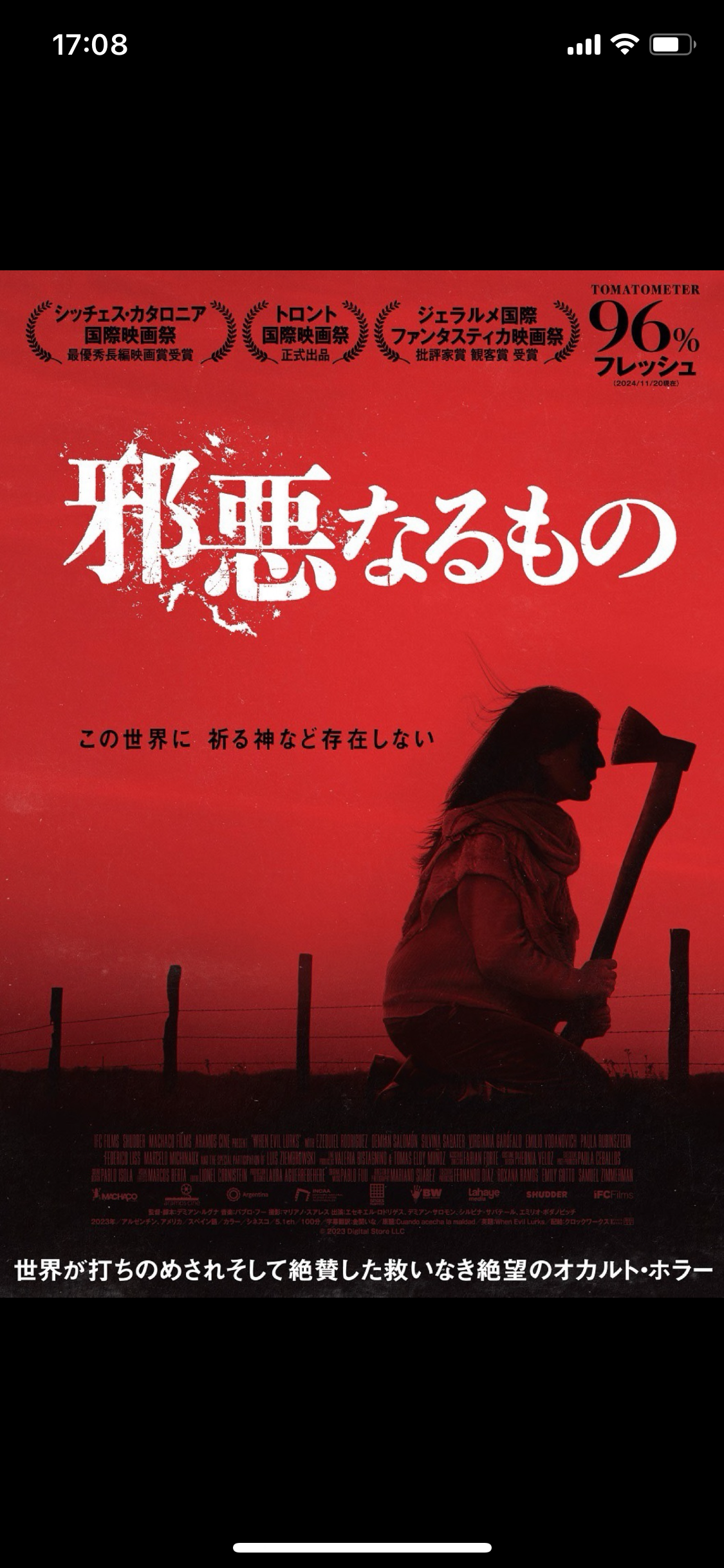 トップ > DISCASレビュー > 邪悪なるもの ryu 2025/06/28 17:10 邪悪なるもの まず撮影、ロケーションが良い。よくある南米の荒削りな雰囲気ではなく、色調質感も落ち着いててカメラも良い。弟が夜道で兄の元嫁を追い抜くショット素晴らしかった。伝染病のメタファーかと思わせて、逆に皆んな鈍感なのも、コロナ以降のホラーとして新鮮。終盤、主人公がそれでも斧を取りに行かざるを得ない理由づけが欲しかった。そこだけ残念。 いいね 共有する 共有する X facebook LINE リンクをコピー コメントする 0 件の返信 (新着順)