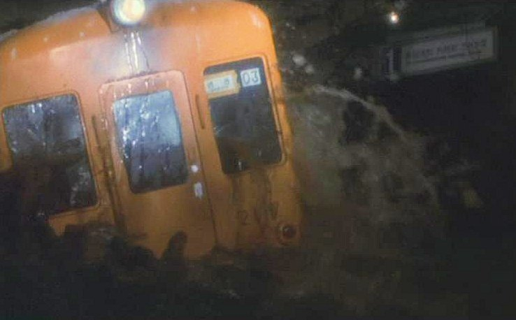 そして、本作最大のみどころは、閉じ込められた地下鉄内に、堤防が決壊し、隅田川の水が地下構内に流れ込み、人々がどんどんおぼれ死ぬというシーン。実際に当時の金額にして1000万円の実物大車両と、2000万円の駅セットを撮影所内の特大プールに設営して、沈みゆく電車を撮影。眼を見開いたまま水中を漂う水死体など、当時トラウマになる観客も多くいたと思います。