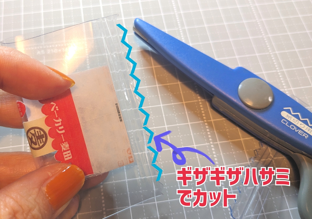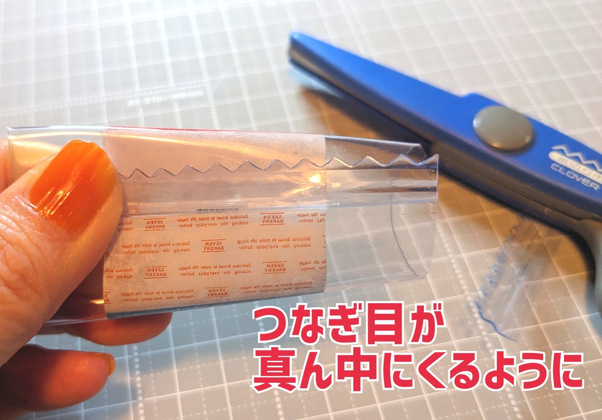 ⑫くっついたらギザギザはさみでカット。(なければ普通のはさみでOK)